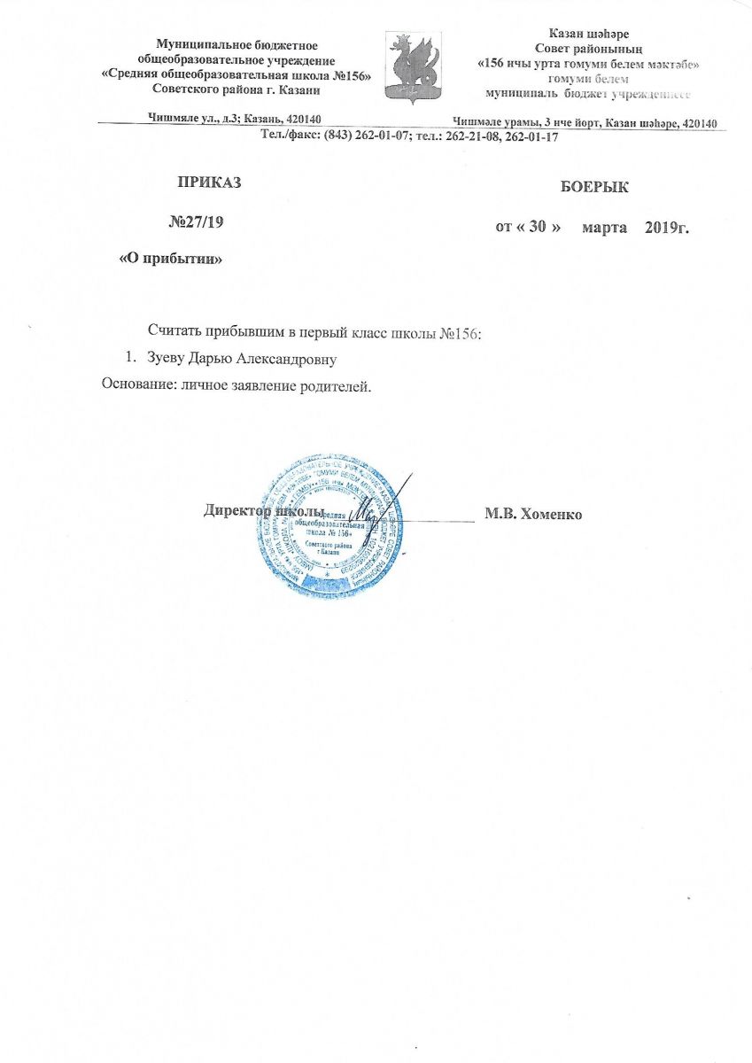 Приказ "О прибытии" №27/19 от 30 марта 2019 (1 человек).