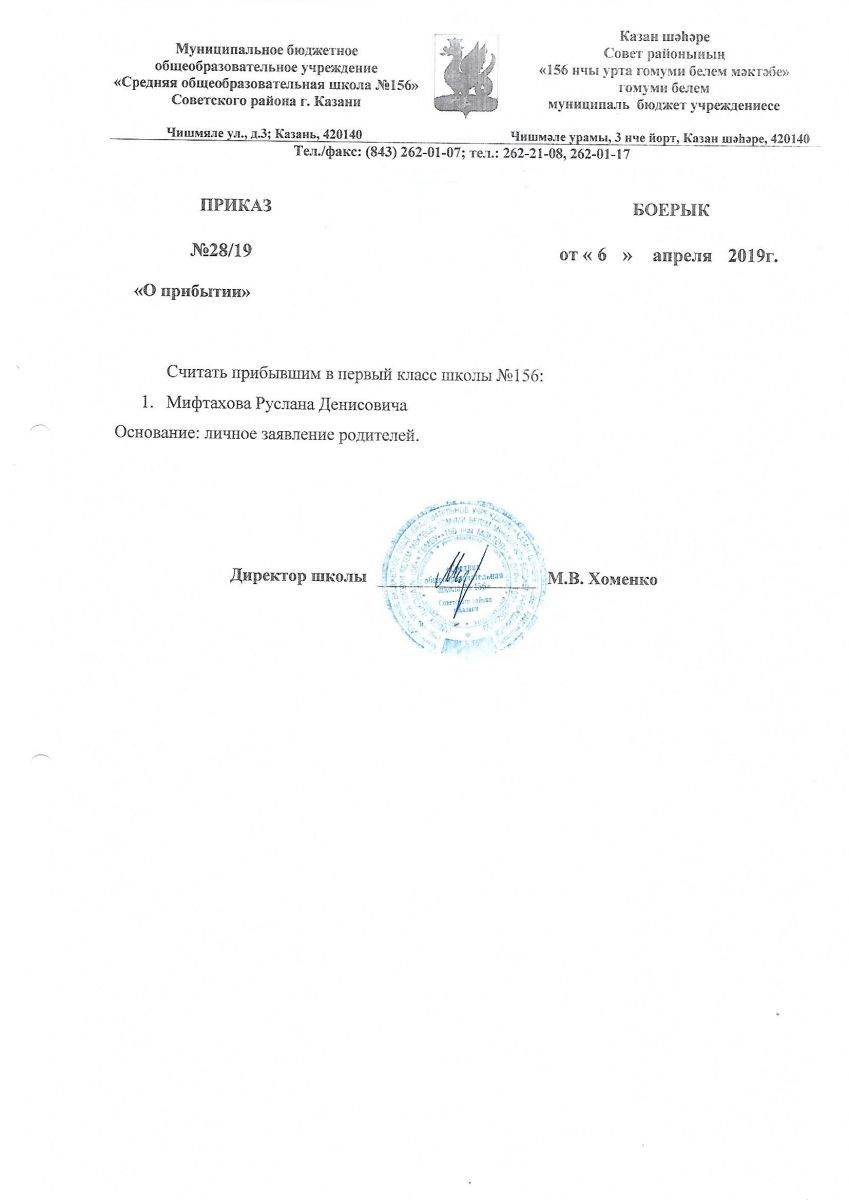 Приказ "О прибытии" №28/19 от 6 апреля 2019 (1 человек).