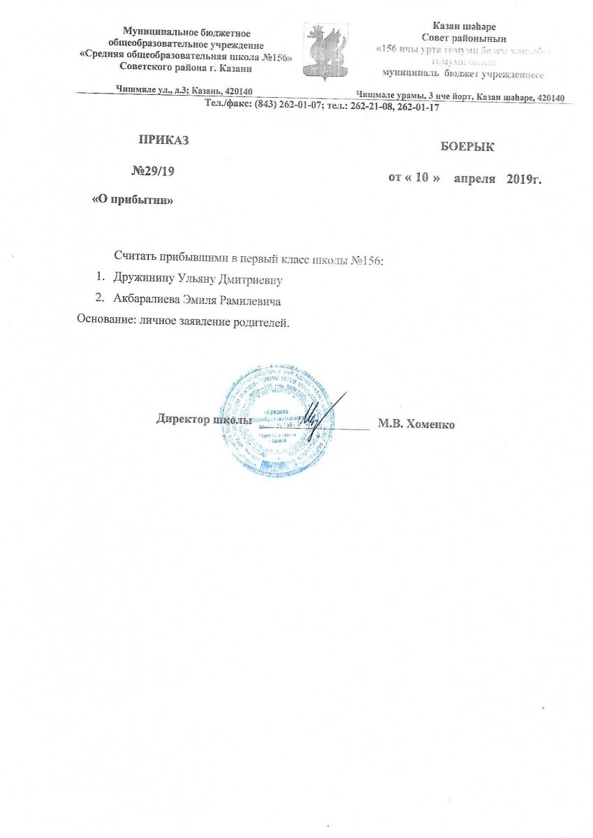 Приказ "О прибытии" №29/19 от 10 апреля 2019 (2 человека).