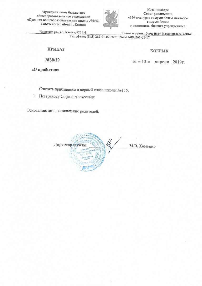 Приказ "О прибытии" №30/19 от 13 апреля 2019 (1 человек).