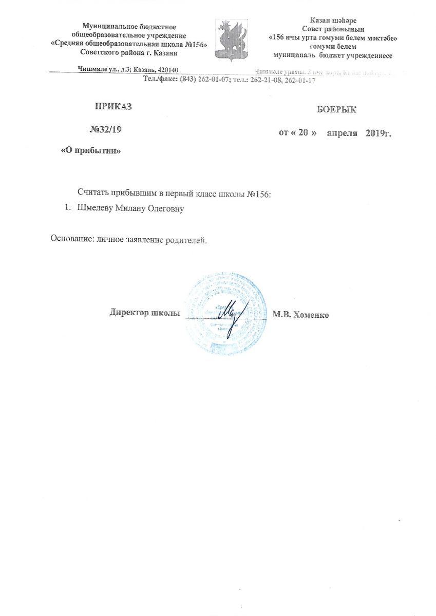 Приказ "О прибытии" №32/19 от 20 апреля 2019 (1 человек).
