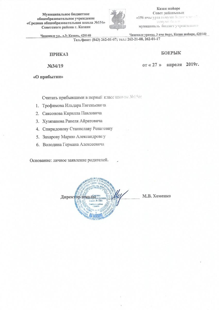 Приказ "О прибытии" №34/19 от 27 апреля 2019 (6 человек).