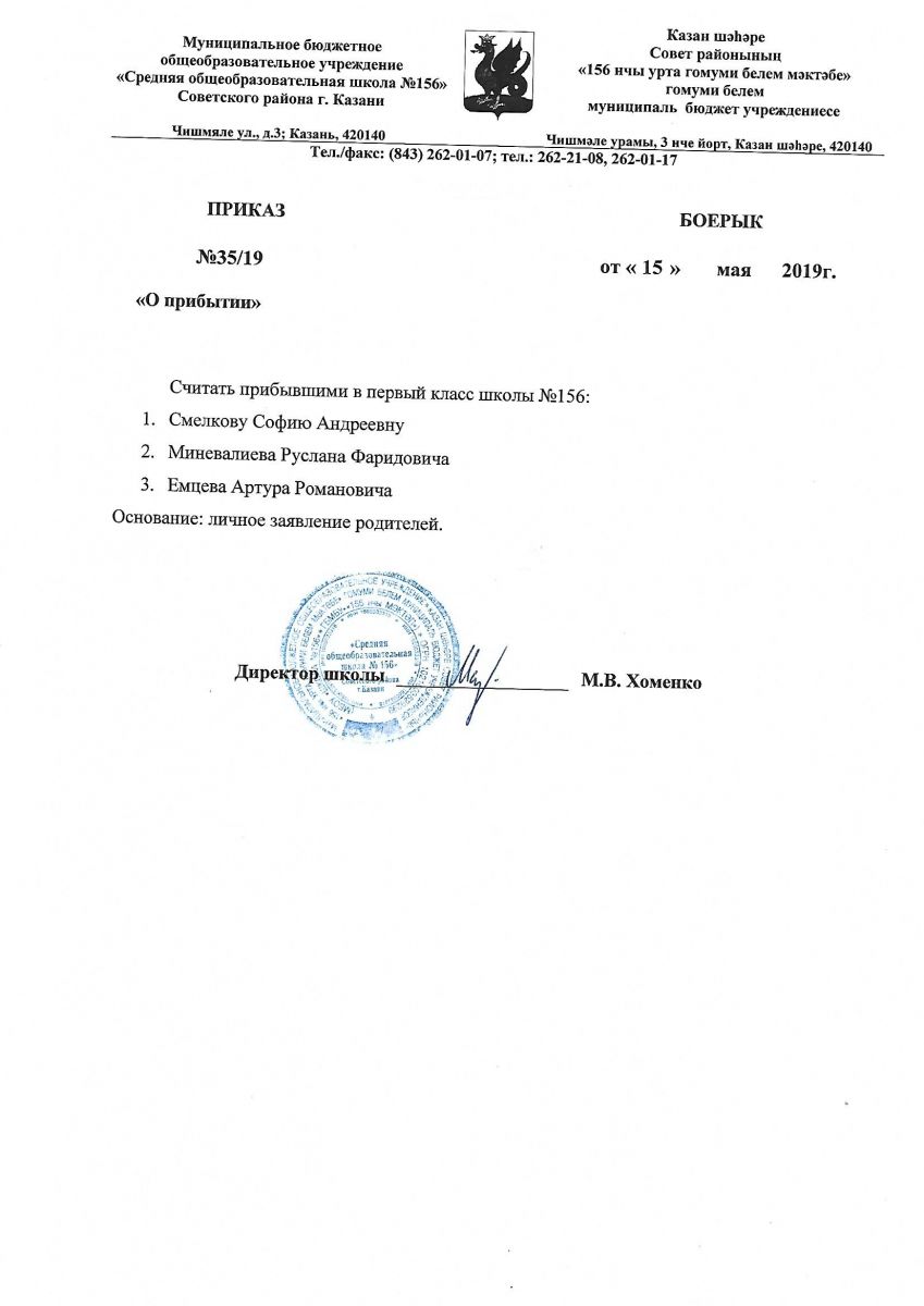 Приказ "О прибытии" №35/19 от 17 мая 2019 (3 человека).