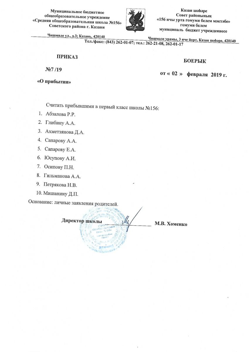 Приказ "О прибытии" №7/19 от 2 февраля 2019 (10 человек).
