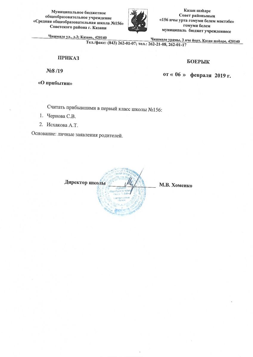 Приказ "О прибытии" №8/19 от 6 февраля 2019 (2 человека).