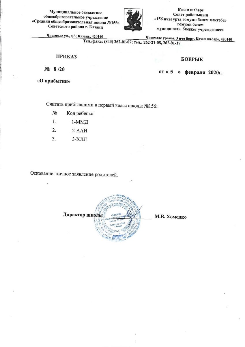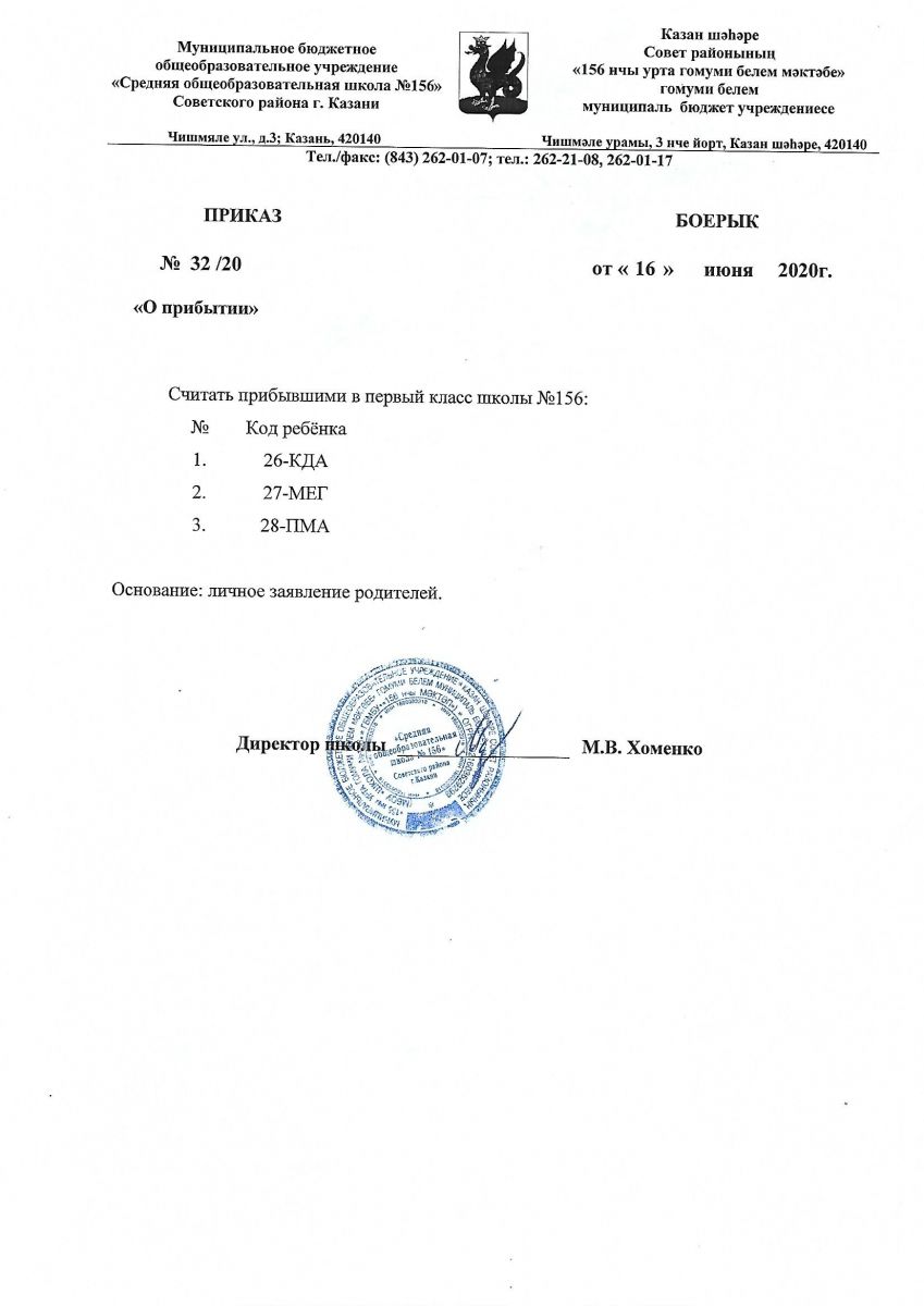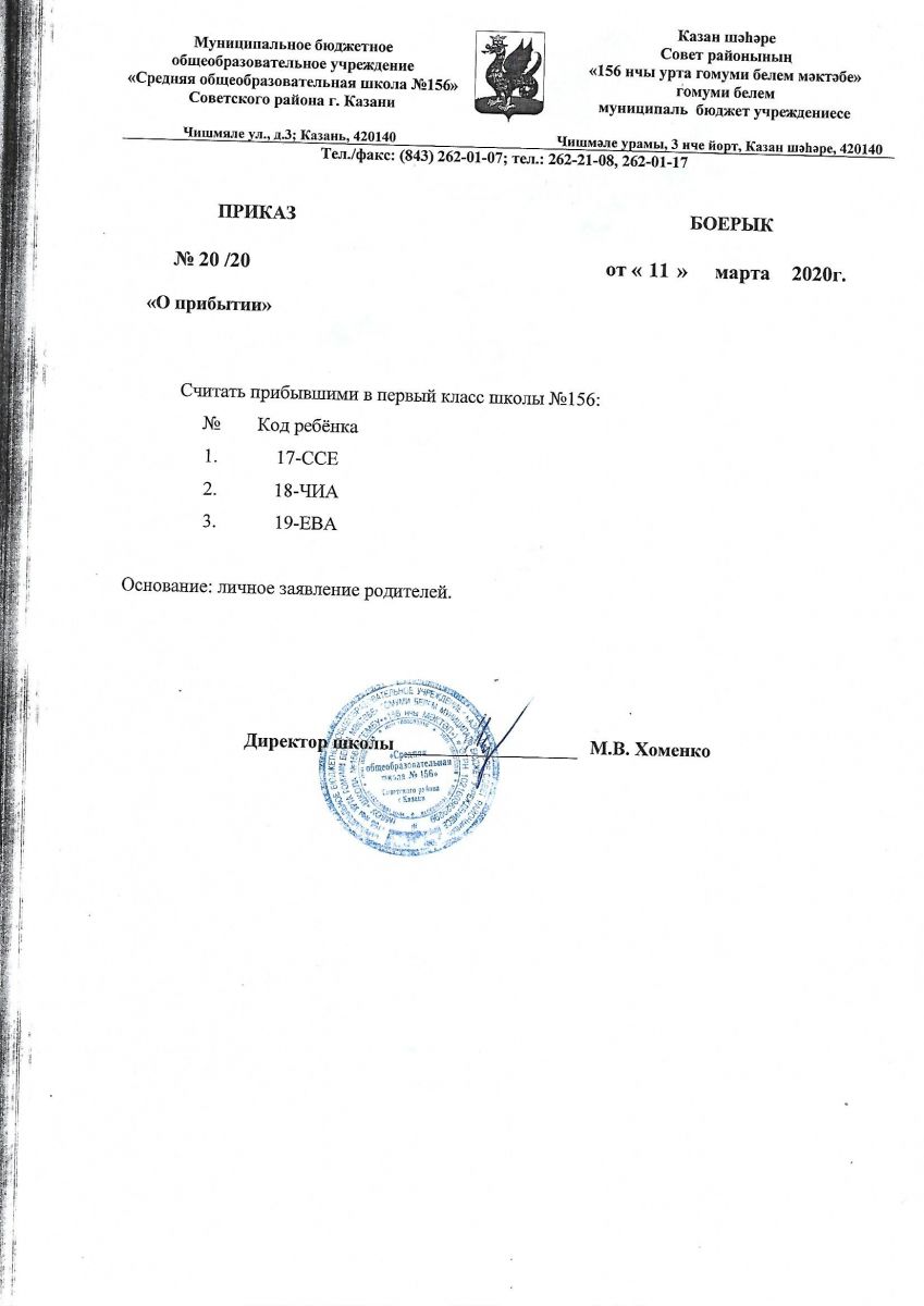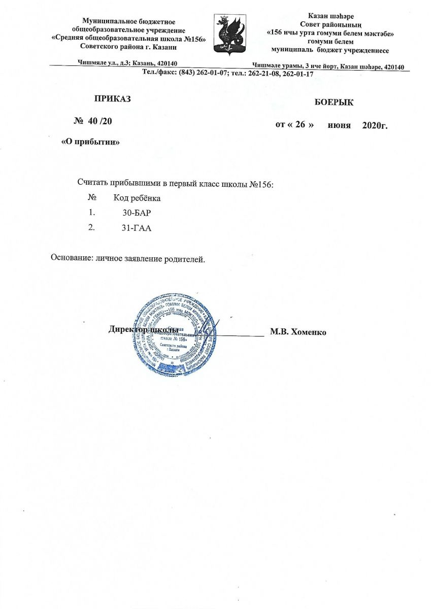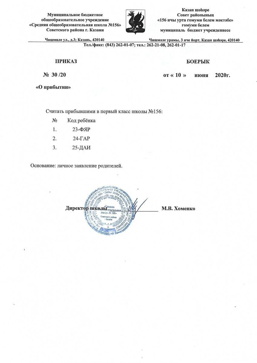 Приказ по школе "О приеме детей в первые классы" (2020)
