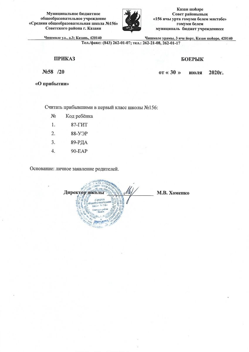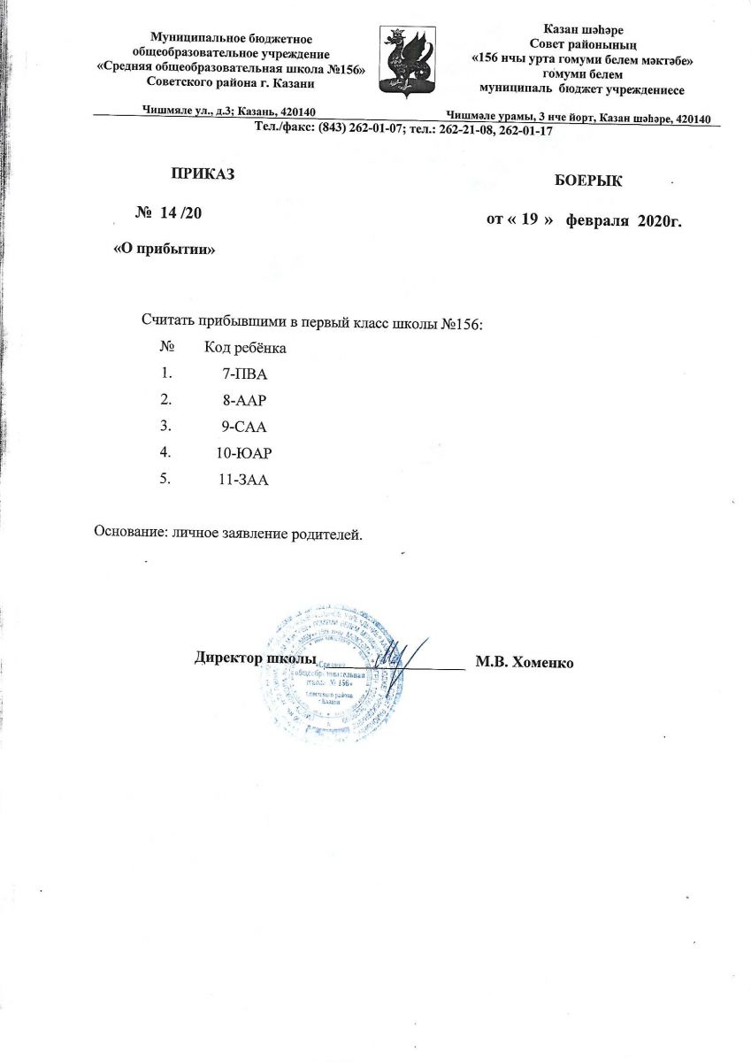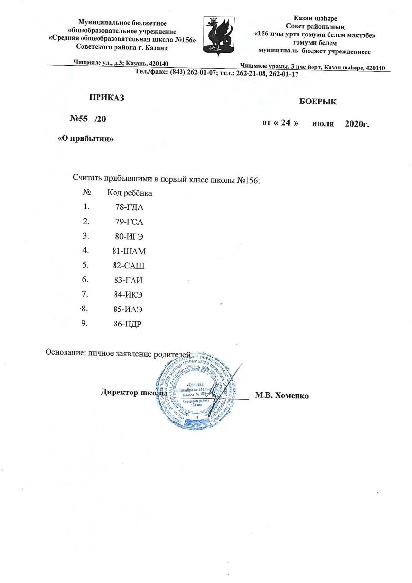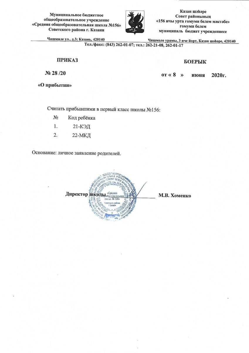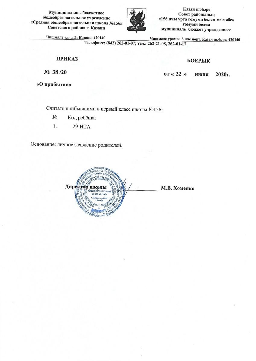 Приказ по школе "О приеме детей в первые классы" (2020)
