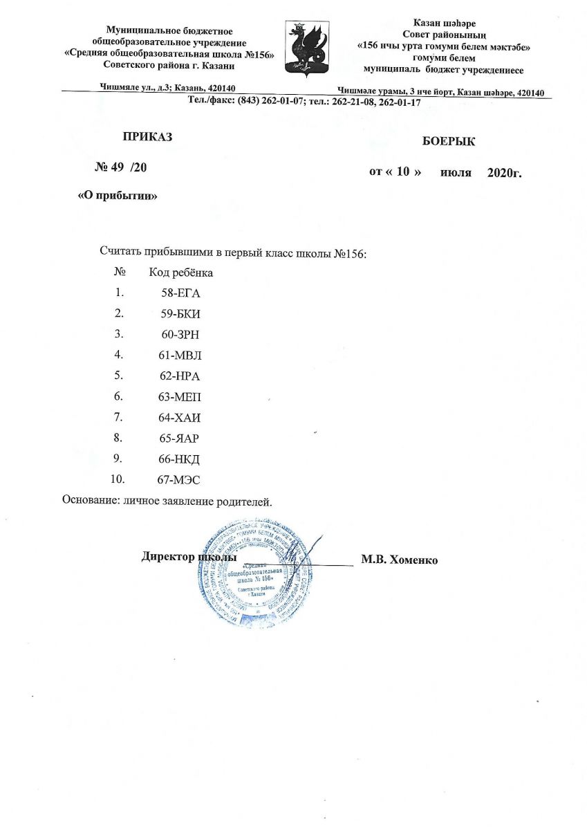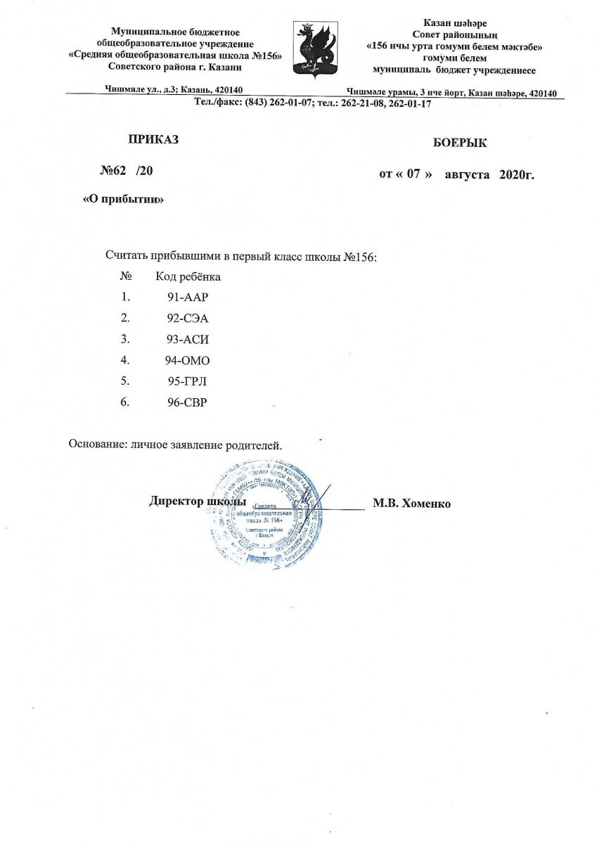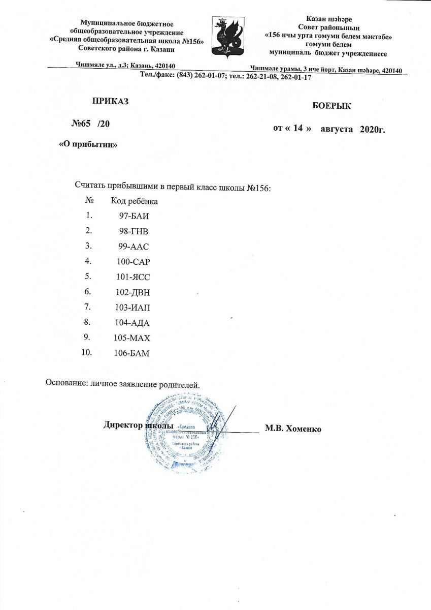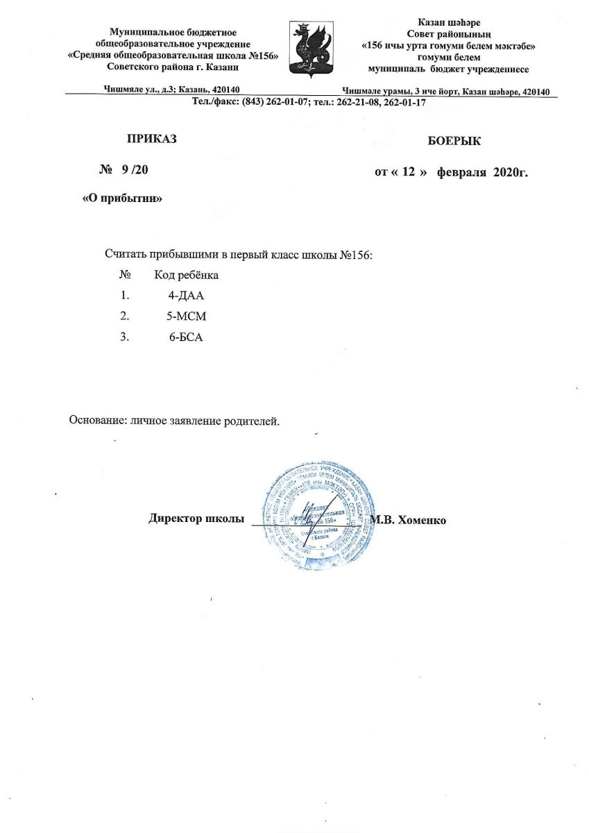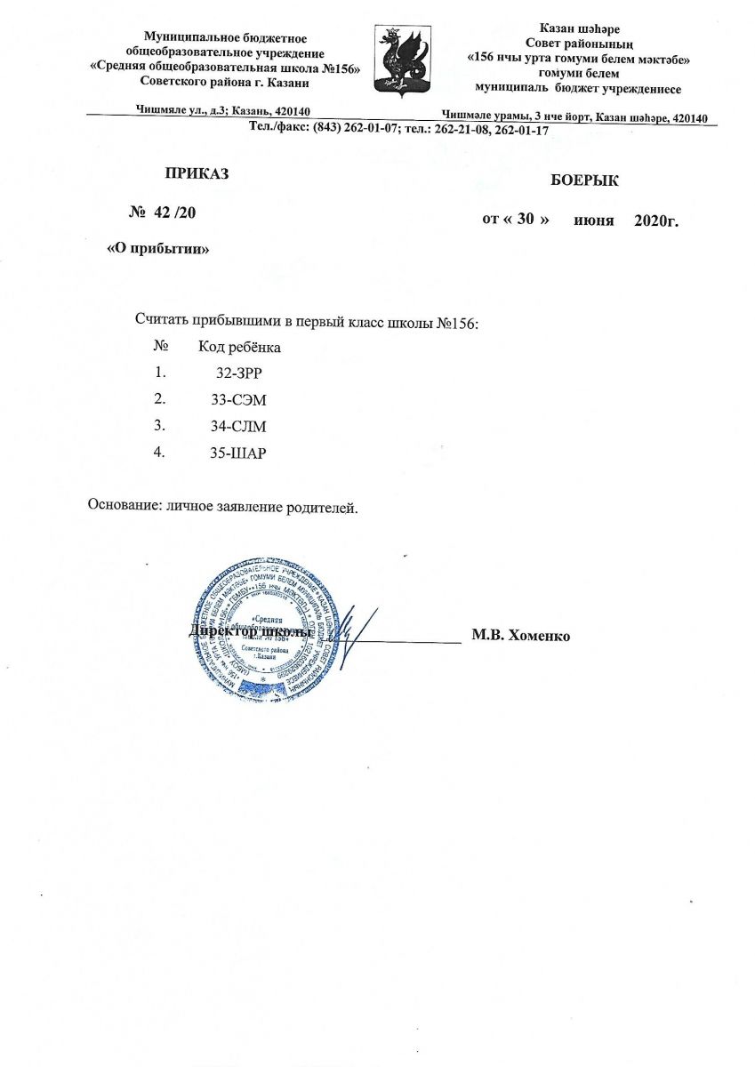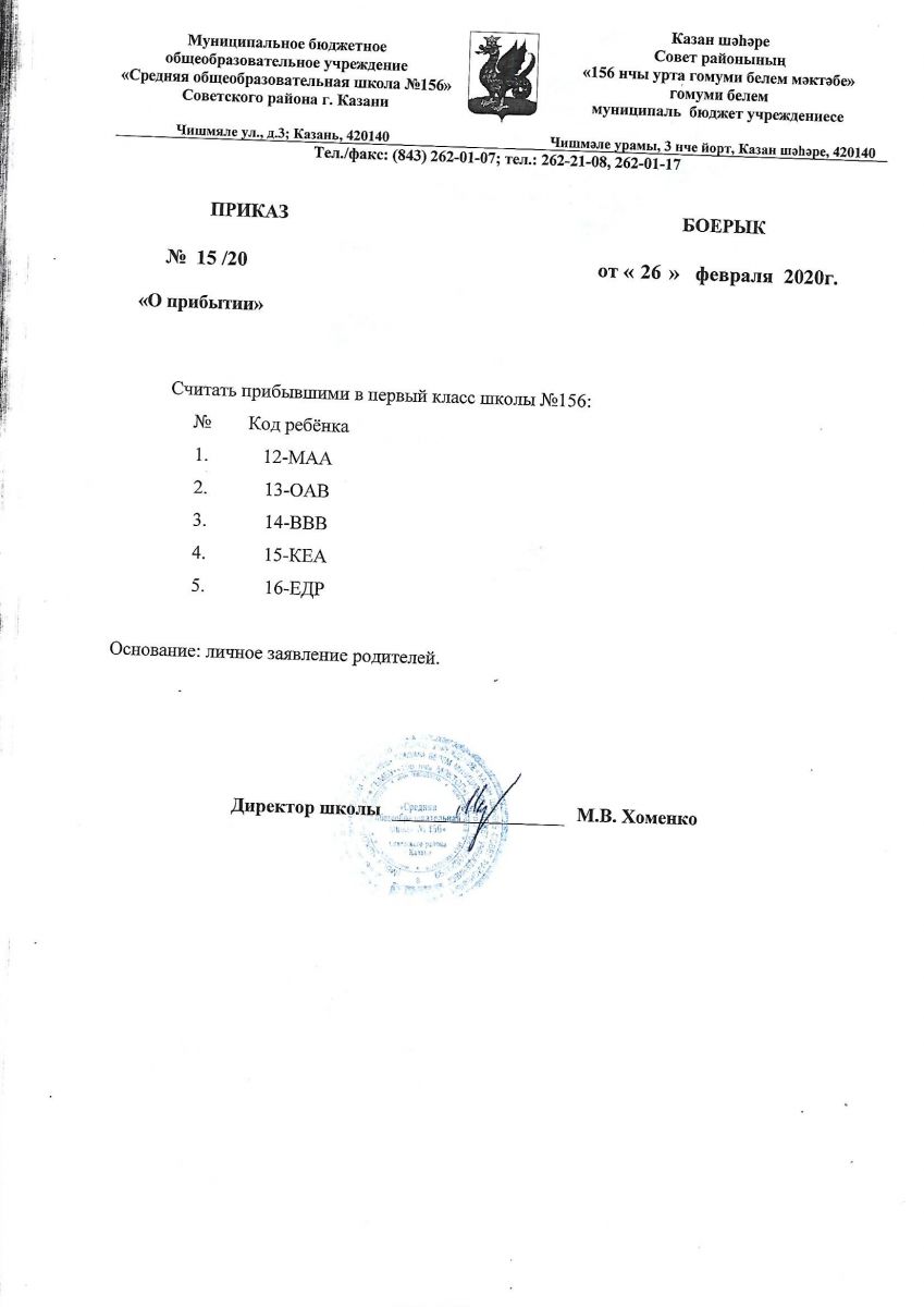 Приказ по школе "О приеме детей в первые классы" (2020)