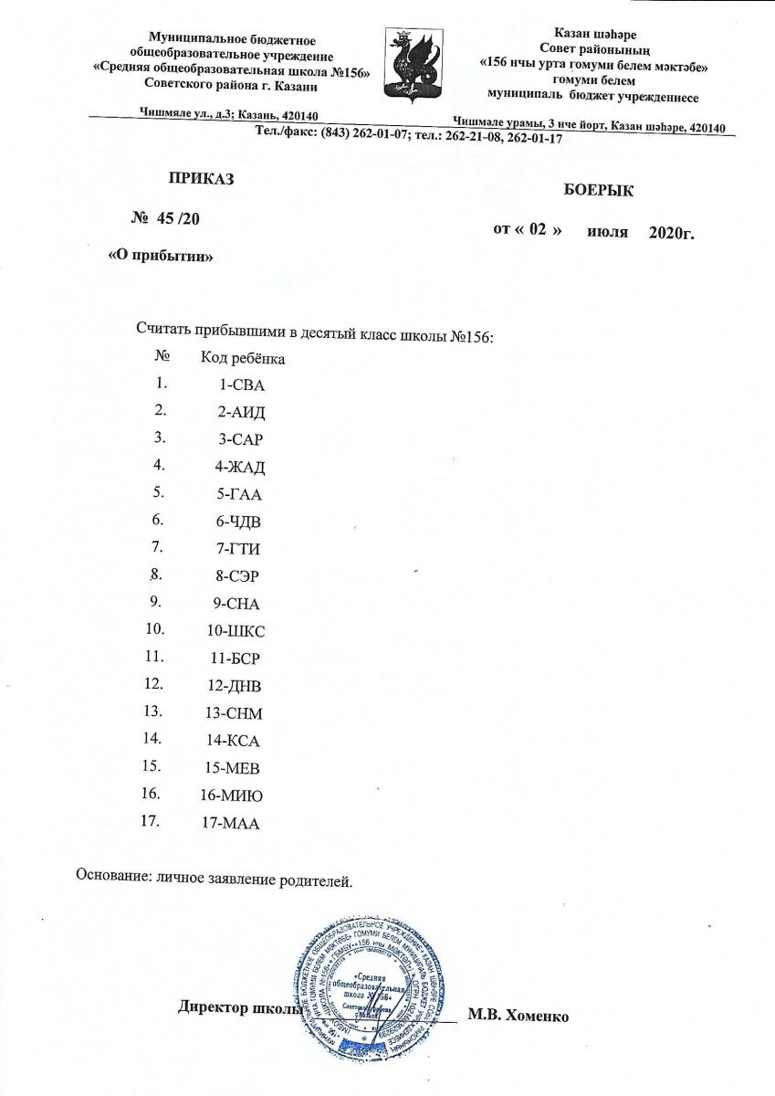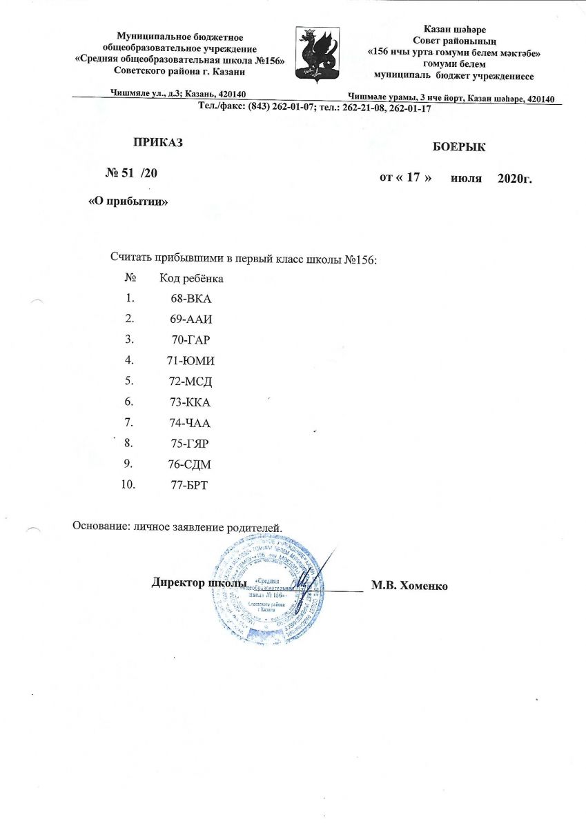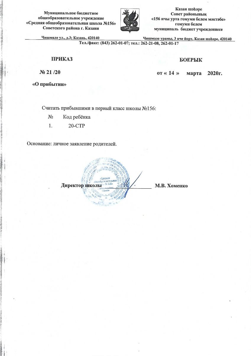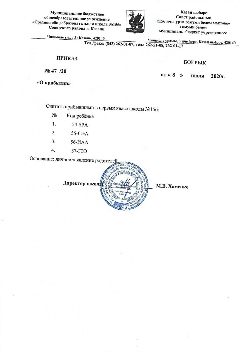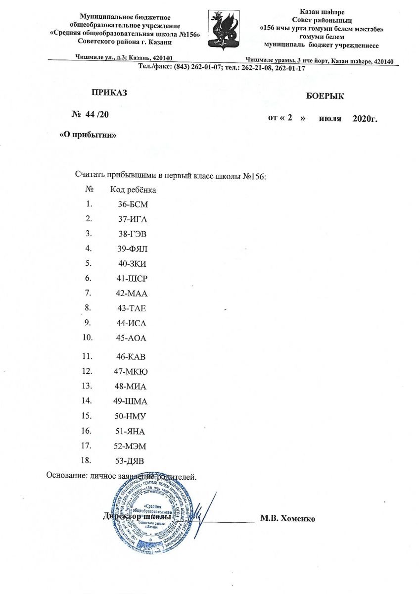 Приказ по школе "О приеме детей в первые классы" (2020)