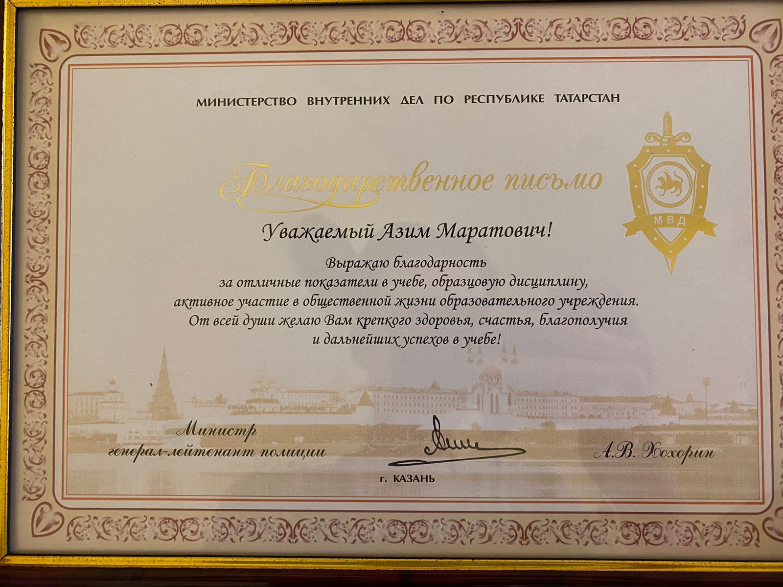 На праздничном концерте в Культурном центре МВД по Республике Татарстан генерал-лейтенант полиции Артем Хохорин наградил благодарственным письмом за отличные показатели в учёбе, образцовую дисциплину, активное участие в общественной жизни образовательного учреждения, учащегося 9 класса Арсланова А.