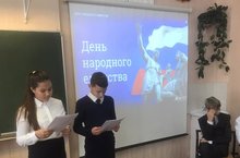 Сегодня для учащихся 8 - 9 классов был проведен классный час, посвященный Дню народного единства. Учителя истории Башкирова Л. М. и Мифтахова К. А. рассказали ребятам об истории праздника, о его происхождении, а также об отношениях между государствами в современном мире. Ученики получили много полезной информации.