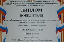 Поздравляем ученика 1 класса Тазеева Карима, который стал победителем республиканского конкурса "Юный исследователь - 2018" в направлении "Науки о природе". Руководитель - Нуриева Г.Н., учитель начальных классовю