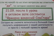 Участники школьного самоуправления "СовСтар" начали агитацию учащихся. 21 сентября учащиеся 5-11 классов будут приглашены на "Ярмарку вакансий". На ней учащиеся смогут вступить в Большой Совет и получить полезную информацию о деятельности самоуправления.
