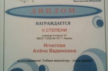 Игнатова Алена, ученица 4А класса, и ее руководитель Батыршина М.Р. снова принесли школе хороший результат - 2 место в региональном этапе Всероссийского фестиваля творческих открытий и инициатив "Леонардо". Молодцы! Желаем дальнейших успехов!
