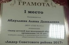 Поздравляем Абдуллину Алину, ученицу 8А класса, и ее руководителя Чугунову С.Р., с 1 местом в районном конкурсе "Лидер Советского района 2017".