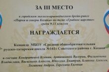 Поздравляем команду 9-классников под руководством Марфина В.Г., занявшую 3 место в городском эколого-краеведческом брейн-ринге "Парки и скверы Казани".