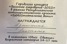 Сегодня проходил городской конкурс "Весенее очарование - 2022" в рамках Республиканского антинаркотического проекта "SаMоSстоятельные дети". В нем принимала участие ученица 9В класса нашей школы Артюхина Анастасия. Насте удалось продемонстрировать свои таланты, навыки, умения и качества. По итогам ей удалось получить диплом в номинации "Мисс Обаяние" в возрастной категории 14-17 лет. Поздравляем Анастасию и желаем не останавливаться на достигнутом!