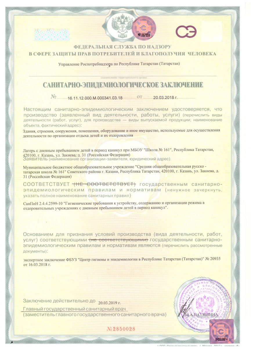 Санитарно-эпидемилогическое заключение о соответствии МБОУ "Школа № 161" государственным правилам и нормативам