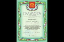Грамотой награждается Казакова Елизавета, ученица 8б класса, за оригинальное выступление в районном конкурсе юных экскурсоводов «Казань-город сердца моего» по теме «История повседневности» (секция русского языка). (руководитель Тимуршина В.Р.)