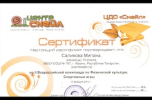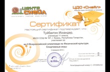 Выдан сертификат учащимся10- 11 классов школы 167 за активное участие во II Всероссийской олимпиаде по Физической культуре. Спортивные игры.(Туйбактин Искандер,Михайлов Артур, Воробьев Валентин,Биктимиров Искандер, Баймитов Искандер, Садреддинов Искандер,Альмеева Алина, Тюрина Влада, Кашапова Резеда, Салихова Милана)