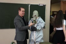 Педагог-организатор ОБЖ Бакеев И.И., совместно с учащимися 8-11 классов провели показательное надевание общевойскового защитного костюма, наложение повязки на голову типа «чепец», оказание первой доврачебной помощи, эвакуация пострадавшего на носилках.