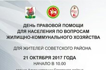 С целью оказания доступной и бесплатной юридической помощи населению, а также с целью правового просвещения граждан Уполномоченный по правам человека в Республике Татарстан совместно с некоммерческим партнерством «Региональный Центр общественного контроля в сфере жилищно-коммунального хозяйства», саморегулируемой организацией «Региональное некоммерческое партнерство «Содружество организаций управляющих многоквартирными домами Республики Татарстан», администрацией Советского района г. Казани проведут тематический День правовой помощи для жителей Советского района г. Казани по вопросам жилищно-коммунального хозяйства с приглашением представителей управляющих компаний.