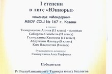 Из 43 команд, принявших участие в отборочном туре, на очный этап турнира прошло 18 лучших команд нашей республики. ТЮБ является командно-личным соревнованием школьников в их способности решать сложные биологические проблемные задачи и защищать их в научной дискуссии – биологическом бое. Учащиеся нашей школы: Сабирова С., Галиуллина К., Ким В., Абдуллин И. и капитан команды «Мандарин» Тимерханова А. успешно выступили в лиге юниоров, заняв 1 командное место. В личном зачете грамотами 1 и 2 степенями были награждены Сабирова С., Галиуллина К. На всех этапах подготовки к турниру команде оказывала помощь наставник: учащаяся 10 б класса Антонова Р. и морально поддерживала Ганиева Л.З. Благодарим всех учителей нашей школы за понимание!