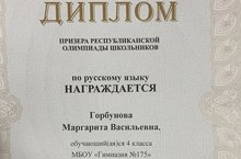 29 января состоялся заключительный этап Республиканской олимпиады школьников по русскому языку. Горбунова Маргарита, ученица 4 «д» (Гафурова А. С.) стала призёром!!! Поздравляем! Молодец! Желаем Маргарите дальнейших успехов и побед!