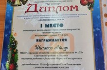 Поздравляем ученика 4 Б класса Шигапова Айнура, занявшего 1 место в Республиканском конкурсе творческих работ "Волшебница зима". Желаем новых побед!