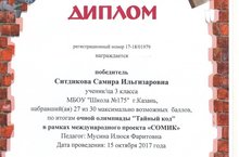 Ситдикова Самира, ученица 3а класса, стала победителем очной олимпиады «Тайный код» в рамках международного проекта «СОМИК» (учитель Мусина Илюся Фаритовна). Гордимся победами наших учеников!