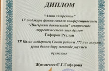 28нче апрель көнне Казан шәһәре Совет районының Абдулла Алиш исемендәге 20нче гимназиясендә “Алиш эзләреннән” исемле IV төбәкара фәнни-гамәли конферециясендә катнашып ,мәктәбебезнең 4нче а сыйныфы укучылары Сәгъдиева Раилә II урын(җитәкчесе Габделвәлиева Р.Н.),Мәхмүтов Морат IIIурын(җитәкчесе Галимуллина Д.Ә.) алдылар.6асыйныфы укучысы Гафаров Руслан (җитәкчесе Гафарова Г.Г.),9а сыйныфы укучысы Исхакова Зилә (җитәкчесе Мостафина Ә.В.) лауреат исеменә лаек булдылар.4нче а сыйныфы укучылары Гильманова Әлфинә,Закирова Азалия(җитәкчеләре Габделвәлиева Р.Н.),6а сыйныфы укучысы Батыршина Лилия (җитәкчесе Валеева Д.Д.) катнашучы дипломнары белән бүләкләнделәр.