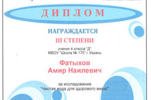 14 января на базе школы №179 Ново-Савиновского района г. Казани прошёл очный тур регионального этапа всероссийского фестиваля творческих открытий и инициатив «Леонардо» Республики Татарстан организованный Благотворительным фондом наследия Менделеева и журналом «Вестник образования России». На этой конференции Фатыхов Амир, ученик 4 «д» класса (учитель Гафурова А. С.) награждён дипломом 3 степени за исследовательскую работу по теме: «Чистая вода для здорового мира!». Поздравляем Амира с победой и желаем дальнейших успехов! Молодец!