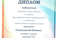 Поздравляем Галиуллину Камиллу, ученицу 1 д класса (учитель: Э.Р. Губаева), победителя городского этапа конкурса по проекту "Культурный дневник первоклассника" в номинации "Лучший дневник первоклассника" Молодец!