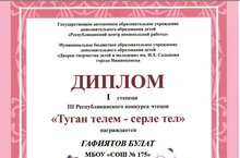 16 февральдә Нижнекамск шәһәренең И. Х. Садыков исемендәге “Балалар һәм яшьләр үзәге”ндә III Республикакүләм сәнгатьле шигырь сөйләүчеләр конкурсы булып узды. Безнең мәктәп укучылары иң югары дәрәҗәдәге дипломнарга лаек булды. I дәрәҗәдәге дипломга - Сарманова Алинә, Ахтямова Рәмзия (5а сыйныф укучылары, укытучы Ахтямова Г.М.), Гафиятов Булат (11 сыйныф укучысы, укытучы Гаязова Э.Ф.); II дәрәҗәдәге дипломга - Бакирова Адилә (7а сыйныф укучысы, укытучы Бәширова А.И.); III дәрәҗәдәге дипломга - Ишмөхәммәтова Лилия (9а сыйныфы укучысы, укытучы Ахтямова Г.М.). Югары дәрәҗәдәге сәнгатьлелек белән аһәңле итеп башкарды алар шигырьләрен. Афәрин, киләчәктә дә сезгә уңышлар телибез!