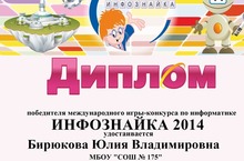 Поздравляем ученицу 4 б класса Бирюкову Юлию (кл.рук.Семашко С.В.) с победой в международном игре-конкурсе по информатике «Инфознайка 2014». Получено наибольшее количество баллов. Поздравляем с победой!!!