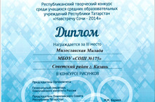 Поздравялем Бухтиенко Елену, ученицу 1д класса, Клементьеву Ольгу, ученицу 4б класса, Кодирову Камиллу, ученицу 2г класса, Милославску Миладу, ученицу 3б класса, с призовыми местами в Республиканском творческом конкурсе среди учащихся средних образовательных учреждений Республики Татарстан "Навстречу Сочи - 2014"!