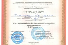 Ученица 8а класса Хисамутдинова Аделя приняла участие в VII городской научно-методической конференции школьников имени К.Д.Ушинского. Она представила свою работу "Школьный музей как центр исслеодвательской деятельности учащихся" и заняла II место.