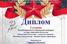 Ученицы нашей гимназии Гафарова Камиля и Крайнова Александра (руководитель Гафарова Гульнара Галимхановна) приняли участие в Республиканском творческом конкурсе, посвященном ко Дню защитника Отечества «Защитники Отечества – герои всех времен» - «Ватанны саклаучылар – барлык вакыт геройлары» и стали победителями различных наминациях. Желаем дальнейших творческих успехов и новых побед нашим юным дарованиям!