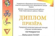 18 февраля на базе МБУДО «Центр внешкольной работы» Ново-Савиновского района г.Казани прошел городской интеллектуальный конкурс «Турнир головоломок». Ученики нашей гимназии приняли активное участие в турнире. Султанов Арсен, ученик 5б класса, стал призером в номинации "Числовые головоломки" (возрастная категория: 9-11 лет), Шайхутдинов Тимофей, ученик 7б класса, стал призером в номинации "Словесные игры-головоломки" (возрастная категория: 12-14 лет). Поздравляем призеров! Благодарим учителей математики Самигуллину М.Г., Мухаметгалимову А.Р.