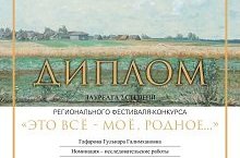 По итогам регионального фестиваля - конкурса "Это всё – мое, родное…" в номинации "Исследовательские работы" учитель родного языка и литературы Гафарова Гульнара Галимхановна стала лауреатом 2 степени! Поздравляем!