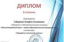 Учителя начальных классов: Гафурова АльфияСалиховна, Айзатова Венера Султановна, Гущина Татьяна Нафанаиловна - приняли участие во II Межрегиональном конкурсе "Мультимедийный урок - новые образовательные возможности ". АльфияСалиховна стала победителем в этом конкурсе. Коллектив школы и МО учителей начальных классов поздравляет своих коллег и от души желает новых творческих успехов в работе.