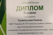 17 февраля прошёл Гала-концерт V Международного литературного конкурса «Джалиловские чтения». Было принято более 40 тысяч заявок участников из 38 регионов Российской Федерации и зарубежных стран. В номинации "Джалиль на языках мира" не было равных Фатыхову Амиру, ученику 10А класса нашей гимназии, занявшему 1 место в своей возрастной категории. Амир достойно прошёл все этапы конкурса и был высоко оценен членами жюри. Поздравляем Амира и желаем ему дальнейших побед! Благодарим учителя-наставника Гульнару Махмудовну Рузиеву!