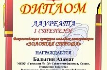 Поздравляем Бадыгина Азамата с заслуженной победой - Дипломом лауреата l степени во Всероссийском конкурсе молодых литераторов "Золотая строфа"! Талант Азамата высоко оценили настоящие корифеи литературного творчества - члены Союза писателей России в номинации "Поэзия". Гордимся и желаем дальнейших побед Азамату! Благодарим учителя начальных классов Эльвиру Рафиковну Ямалутдинову!