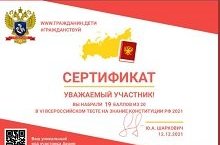 В рамках внеурочной деятельности обучающиеся 6-9 классов 12-13 декабря приняли участие в Акции "Всероссийский тест на знание Конституции РФ". Целью акции является - повышение общей правовой грамотности и знания основного закона России