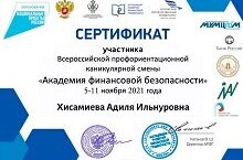 Хисамиева Адиля стала участницей Всероссийской профориентационной каникулярной смены "Академия финансовой безопасности" для обучающихся 8-11 классов из всех регионов России. В течение 7 дней Адиля осваивала основы финансовой безопасности. Каникулярная смена проводилась в рамках реализации Федерального проекта "Успех каждого ребенка" Национального проекта "Образование", нацеленного на личностное, профессиональное самоопределение школьников.