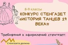 Друзья! Приглашаем обучающихся 8-9 классов принять участие в конкурсе стенгазет "История танцев 19 века"! Требования к оформлению стенгазет: Стенгазета должна представлять коллективную творческую работу, отражать тематику, размер стенгазеты: А1, можно разместить фотографии, рисунки, рассказ, аппликации. Срок сдачи: 18 декабря!
