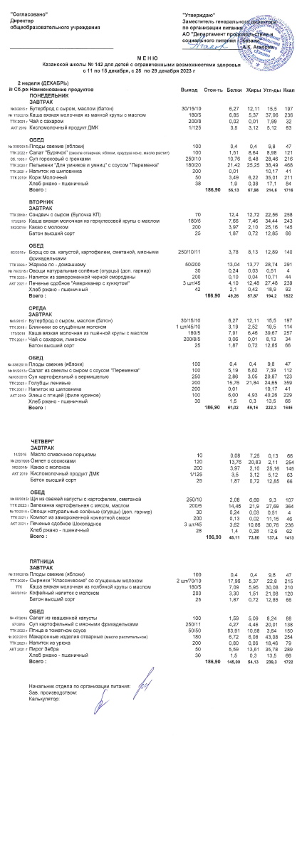 Меню с 11 по 15 декабря, с 25 по 29 декабря 2023 года