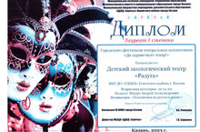 Диплома лауреата I степени городского фестиваля театральных коллективов, прошедшего недавно в ЦДОД «Заречье», удостоен спектакль вечерней группы экологического театра «Радуга» «Братья по разуму» (автор – П.И.Ломовцев). Наш театр оказался в числе лучших - наравне с коллективами школьного театра «Парус» 6 гимназии, театральной студии «Первые роли» 5 лицея и театральным коллективом «77 параллель» 77 школы. Участники фестиваля отметили теплую атмосферу конкурса, чёткую организацию и доброжелательное отношение организаторов. Надеемся, что и в следующий раз наша театральная группа сможет достойно представить здесь свой коллектив с новой постановкой!