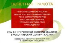 Городской детский эколого-биологический центр был награжден почетной грамотой Министерства экологии и природных ресурсов РТ за победу в конкурсе "Эковесна 2017" в номинации "Экоцентр", проведенного по результатам санитарно-экологического двухмесячника по очистке территорий населенных пунктов Республики Татарстан.