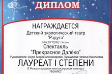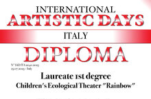Отправленная в Италию видеозапись последнего выступения театра "Радуга" со спектаклем по пьесе П.И. Ломовцева "Братья по разуму" заслужила диплом лауреата 1 степени международного фестиваля "International Artistic Days". Поздравляем всех актёров и руководителя театра Шкуро А.А. с этим достижением и с нетерпением ждём открытия нового театрального сезона!